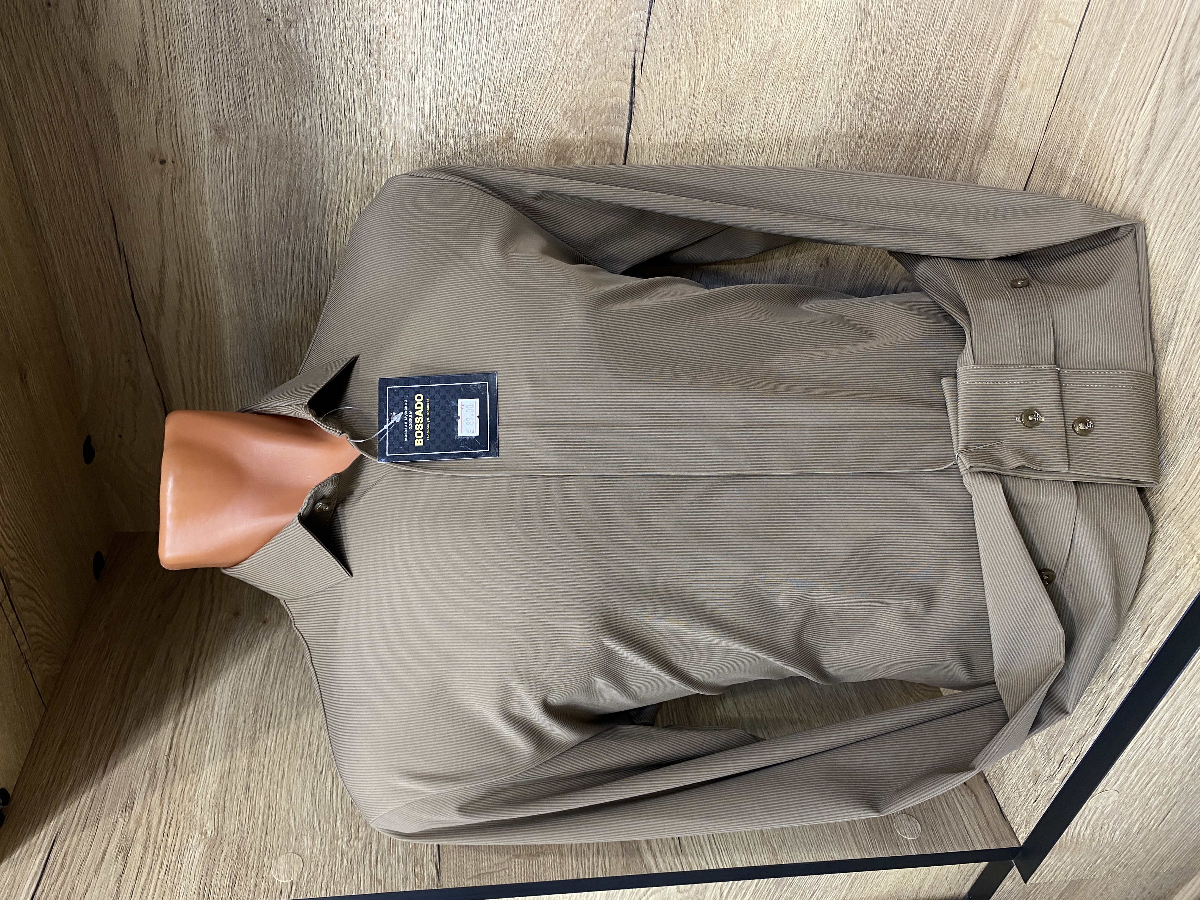 - Детали: Скрытая планка (без видимых пуговиц), классический жесткий воротник, который держит форму, и аккуратные манжеты.
