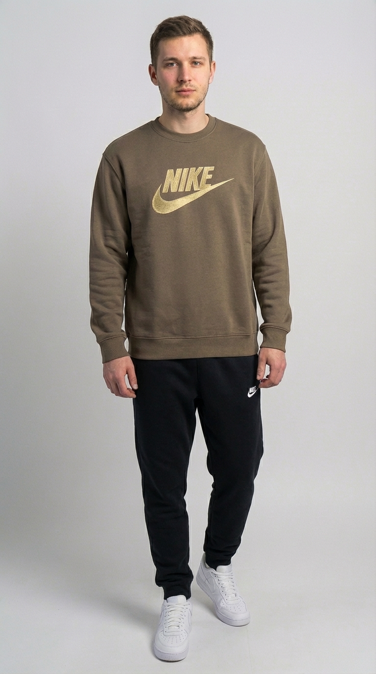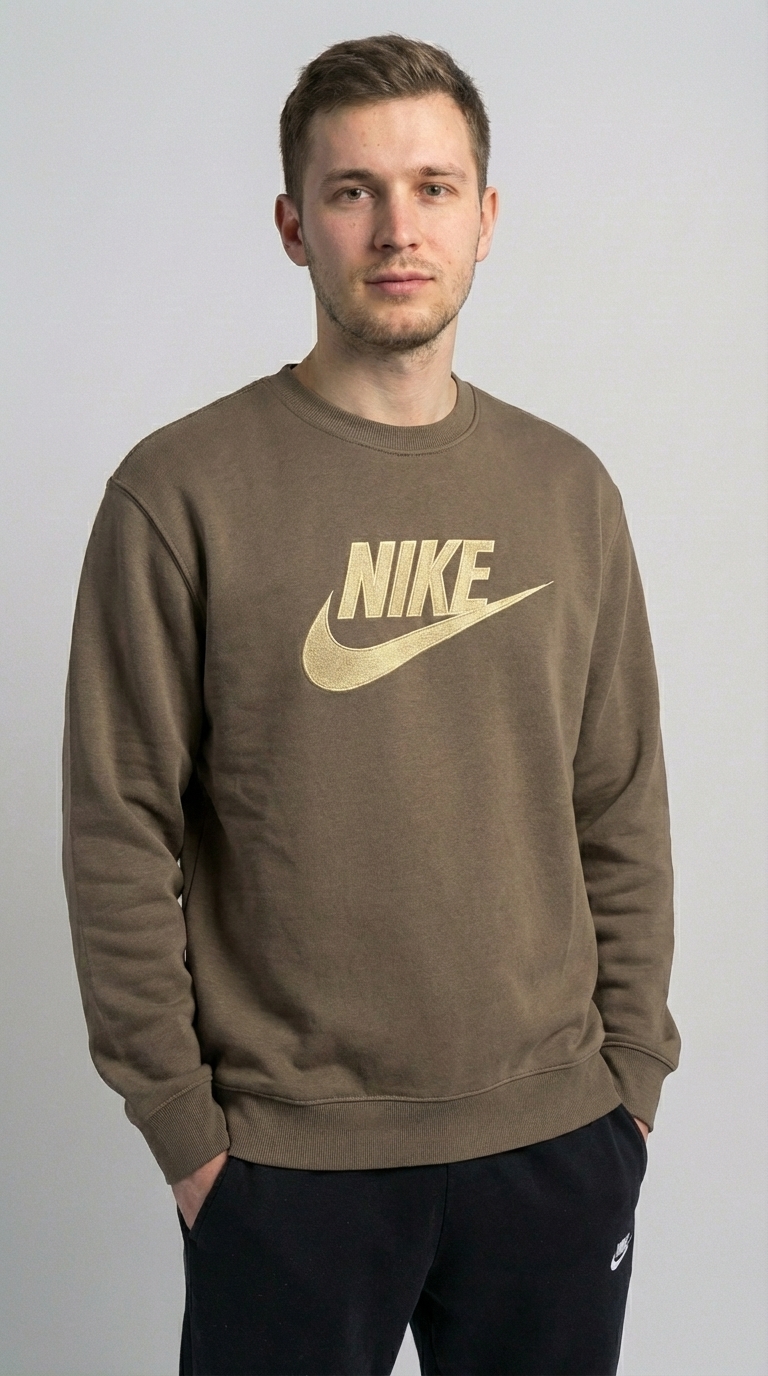 Стильный и комфортный свитшот от Nike для тех, кто выбирает активный образ жизни и ценит проверенный временем дизайн. Модель выполнена в приглушенном оливковом цвете с классическим золотистым логотипом на груди, что делает её идеальным выбором для повседневного гардероба.