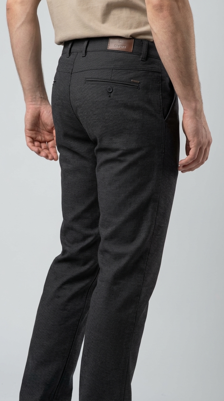 Универсальное решение для тех, кто устал от обычных джинсов, но не готов к строгому костюму. Эти брюки в цвете «антрацит» выполнены из плотной ткани с уникальным микроплетением, которое придает им визуальную глубину и премиальный вид.