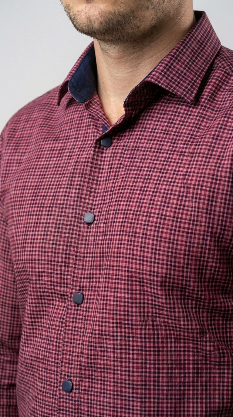 Стильное решение для создания образа в стиле Smart Casual. Эта мужская рубашка в насыщенном бордовом цвете с классическим микропринтом в клетку идеально подходит как для офиса, так и для неформальных встреч. Модель выполнена в крое Slim Fit, который обеспечивает точную посадку по фигуре, создавая аккуратный и современный силуэт.