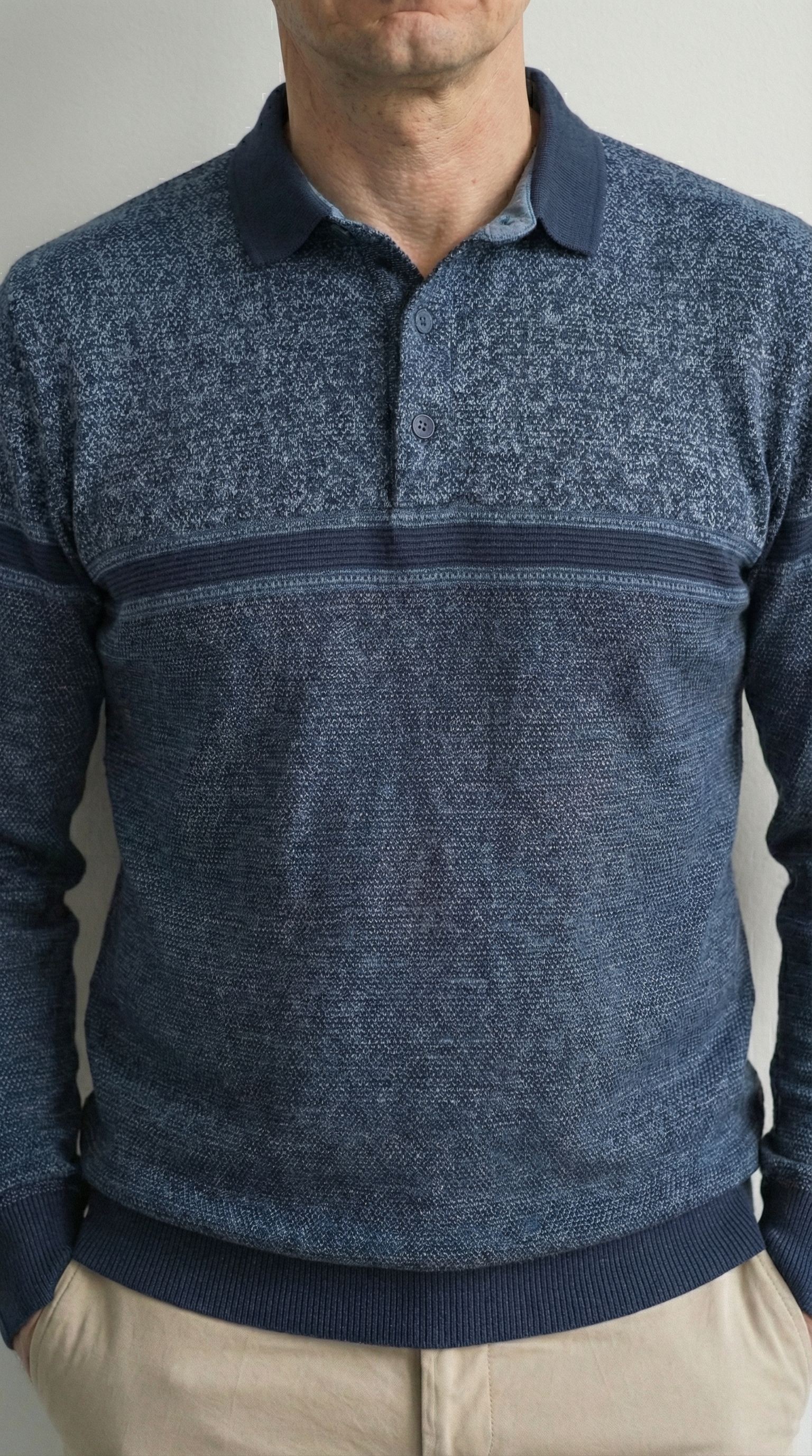 Практичная и стильная модель для тех, кто ценит классику с современными деталями. Этот джемпер-поло от BOSSADO выполнен в глубоком синем цвете с эффектным разделением фактур: верхняя часть имеет меланжевый узор, а нижняя — более плотную однотонную вязку.